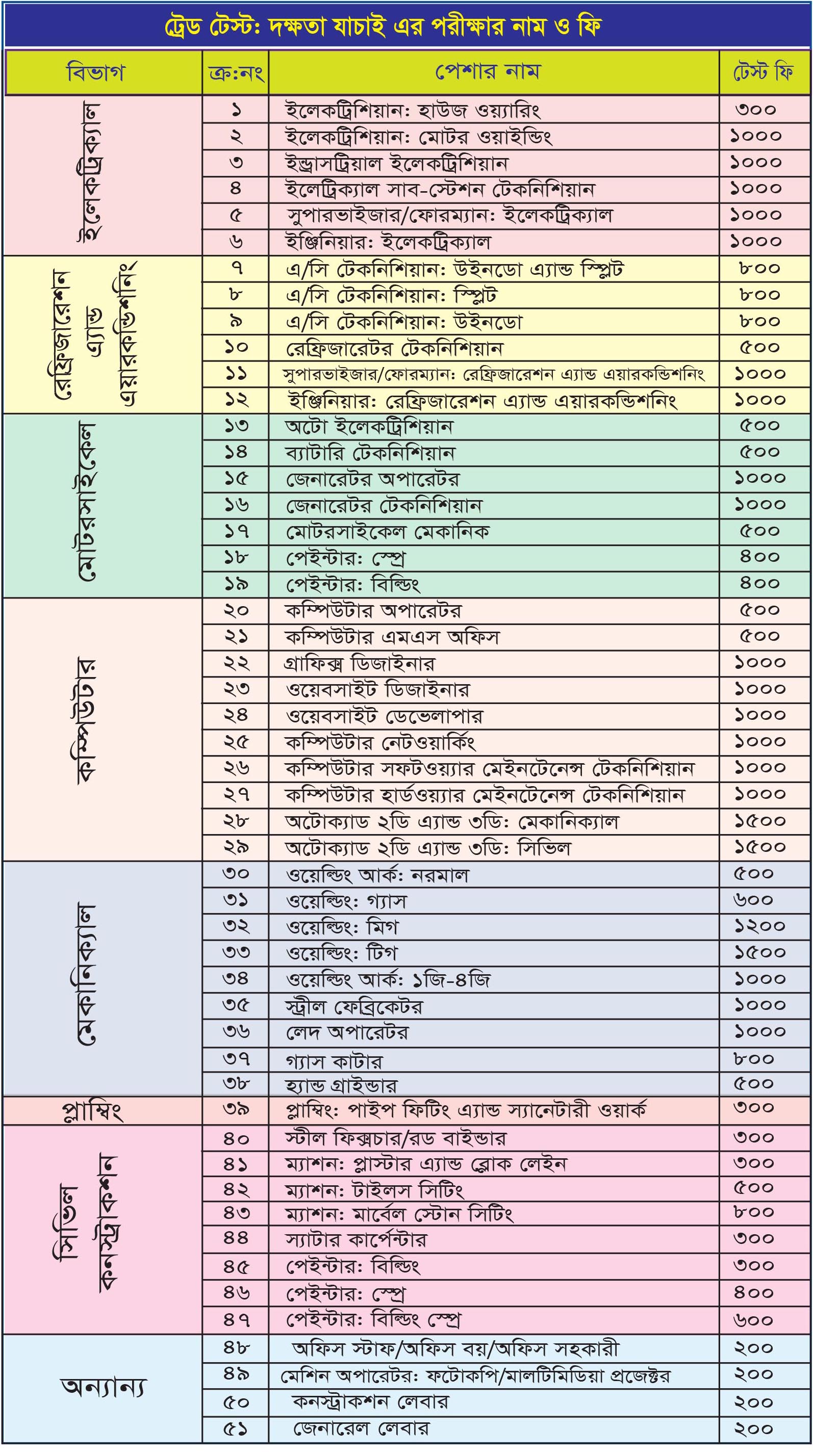ট্রেড টেস্ট, দক্ষতা যাচাই এর পরীক্ষার নাম ও ফী